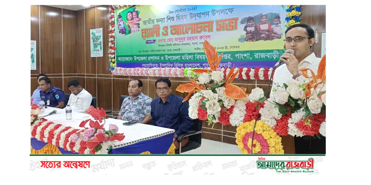 পাংশায় জাতীয় কন্যা শিশু দিবস উদযাপন উপলক্ষে সোমবার র্যালী ও আলোচনা সভা অনুষ্ঠিত হয়েছে। র্যালি শেষে পাংশা উপজেলা পরিষদ সম্মেলন কক্ষে আলোচনা সভা অনুষ্ঠিত হয়। উপজেলা প্রশাসন ও উপজেলা মহিলা বিষয়ক অধিদপ্তরের আয়োজনে এবং ইসলামিক রিলিফ বাংলাদেশ পাংশার সহযোগিতায় আলোচনা সভায় সভাপতিত্ব করেন উপজেলা নির্বাহী অফিসার (ভারপ্রাপ্ত) মো. মাসুদুর রহমান রুবেল। এসময় উপস্থিত ছিলেন উপজেলা মহিলা বিষয়ক কর্মকর্তা এস এম আব্দুল সালাম, প্রকল্প বাস্তবায়ন কর্মকর্তা আসলাম হোসেন, মৎস্য অফিসার সাইদ আহমেদ, উপজেলা খাদ্য নিয়ন্ত্রক একেএম শাহনেওয়াজ প্রমুখ। বিভিন্ন স্কুলের শিক্ষক-শিক্ষার্থী সহ সংবাদকর্মীগণ উপস্থিত ছিলেন।