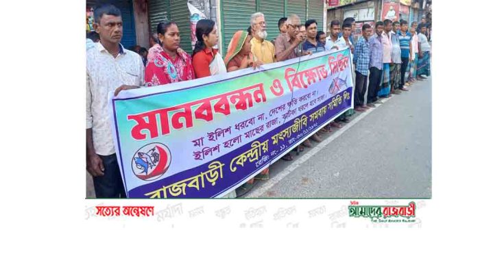 রাজবাড়ীতে “মা ইলিশ ধরবো না দেশের ক্ষতি করবো না, ইলিশ হলো মাছের রাজা ঝাটকা ধরলে হবে সাজা” প্রতিপাদ্য ধারণ করে জেলায় নিবন্ধিত সকল মৎস্যজীবীদের প্রণোদনা প্রদানের ব্যবস্থা গ্রহণের দাবিতে মানববন্ধন