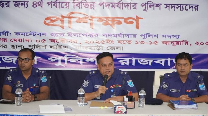 রাজবাড়ী জেলা পুলিশের উদ্যোগে গত শনিবার নির্বাচনী দায়িত্ব সুষ্ঠুভাবে সম্পাদনের লক্ষ্যে পুলিশের দক্ষতা ও সক্ষমতা বৃদ্ধির জন্য চতুর্থ পর্যায়ে বিভিন্ন পদমর্যাদার পুলিশ সদস্যদের প্রশিক্ষণ রাজবাড়ী পুলিশ লাইন্স ড্রিল শেডে অনুষ্ঠিত